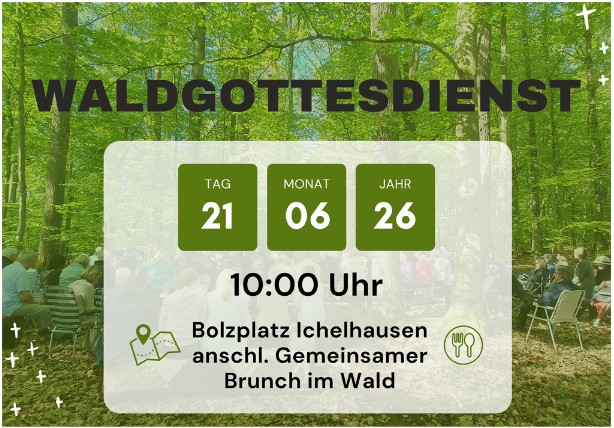 Waldgottesdienst Veröffentlicht am 11. April 202623. April 2026 von szimmermann 21-06-2026 10:00 Uhr Ichelhausen